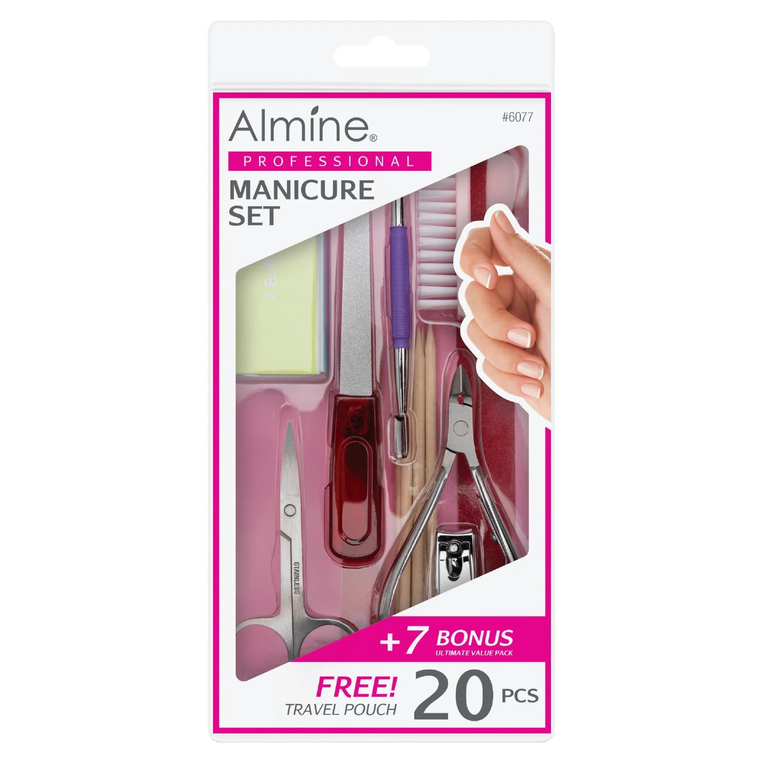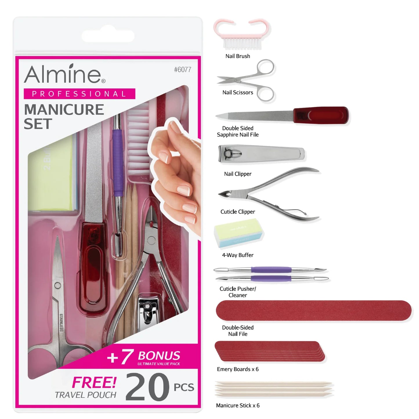 Mantenga sus uñas en óptimas condiciones con el set de manicura profesional Almine, que contiene 20 piezas esenciales para ayudar a mantener sus uñas afiladas y con un aspecto impecable sin importar a dónde vaya. Este juego profesional incluye un pulidor de 4 vías, una lima de zafiro de doble cara, unas tijeras para uñas curvas, un cortaúñas, un cepillo para uñas y una tabla de salón para lograr una manicura perfecta al estilo de un salón de belleza. La práctica bolsa de viaje le permite mantenerse organizado dondequiera que vaya. ¡Mantén tus uñas en perfecto estado con el Set de Manicura Profesional Almine!