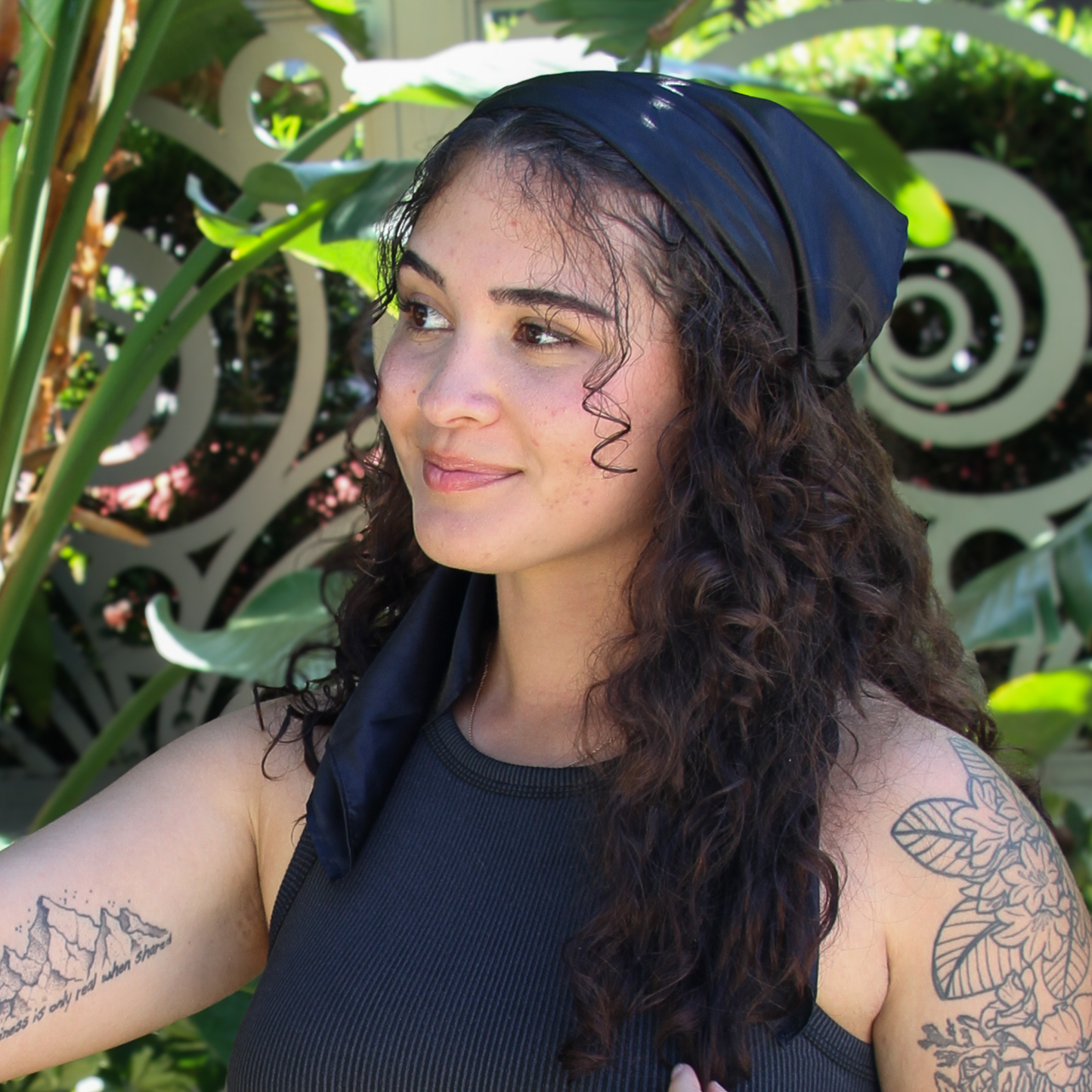 Woman wearing a silky black Broadus Collection head scarf by Shante & Snoop Dogg with gold hoop earrings and brown top