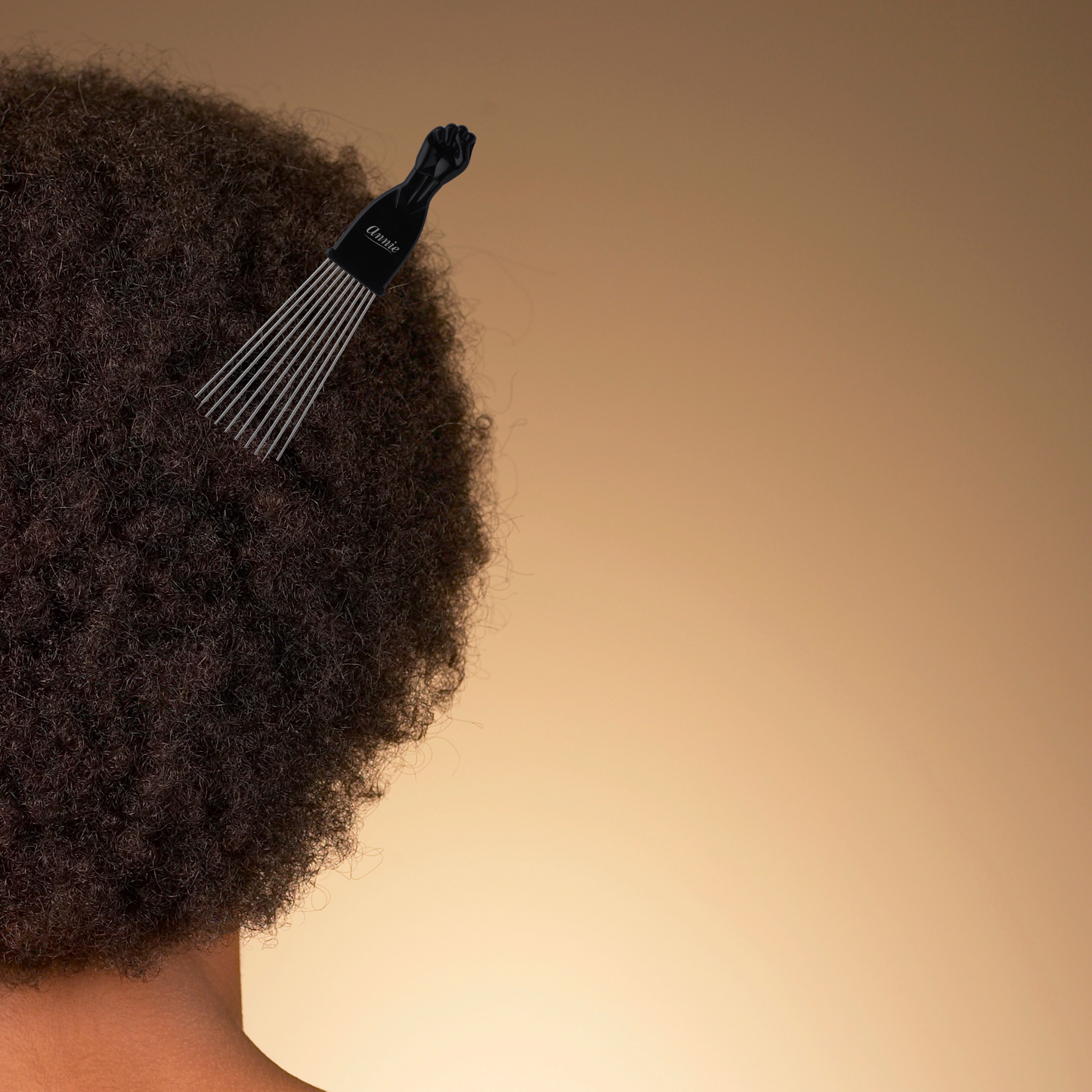 The Annie Afro Styling Pik is not just functional but also a stylish addition to your hair care arsenal. Its sleek black color adds a touch of elegance, while the decorative fist handle serves as a symbol of empowerment and pride in your natural hair.