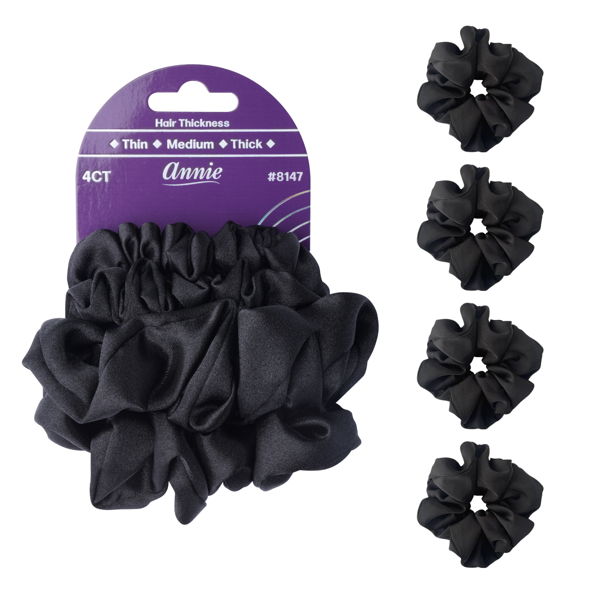 Annie Satin Scrunchies Thin & Regular, 4 Count Fancy Hair Ties, Black